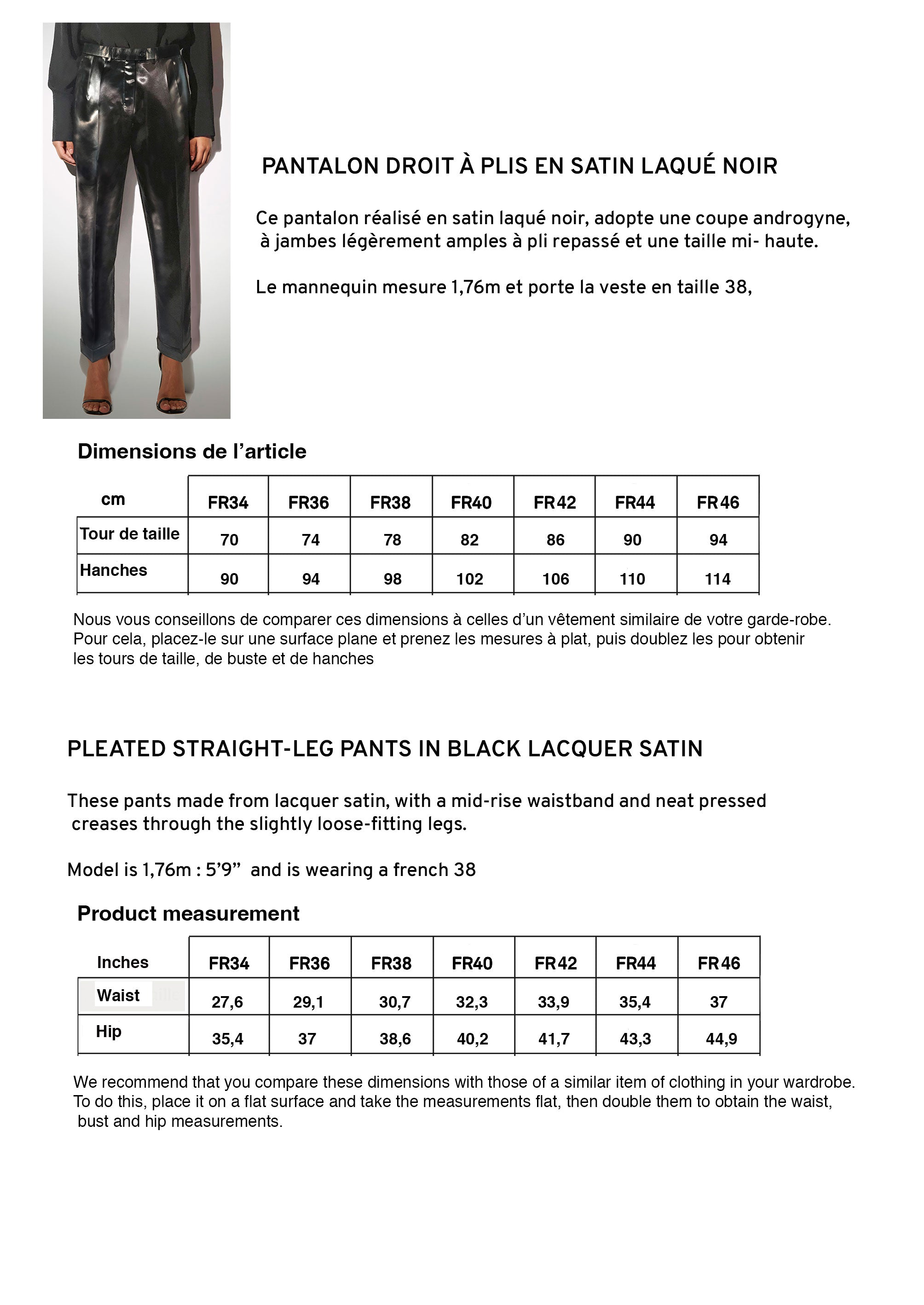 Ce pantalon réalisé en satin laqué noir, adopte une coupe androgyne, à jambes légèrement amples à pli repassé et une taille mi- haute. Son style intemporel associé à son tissu technique chic en font une pièce forte indémodable à porter en toutes occasions du petit matin jusqu'au bout de la nuit