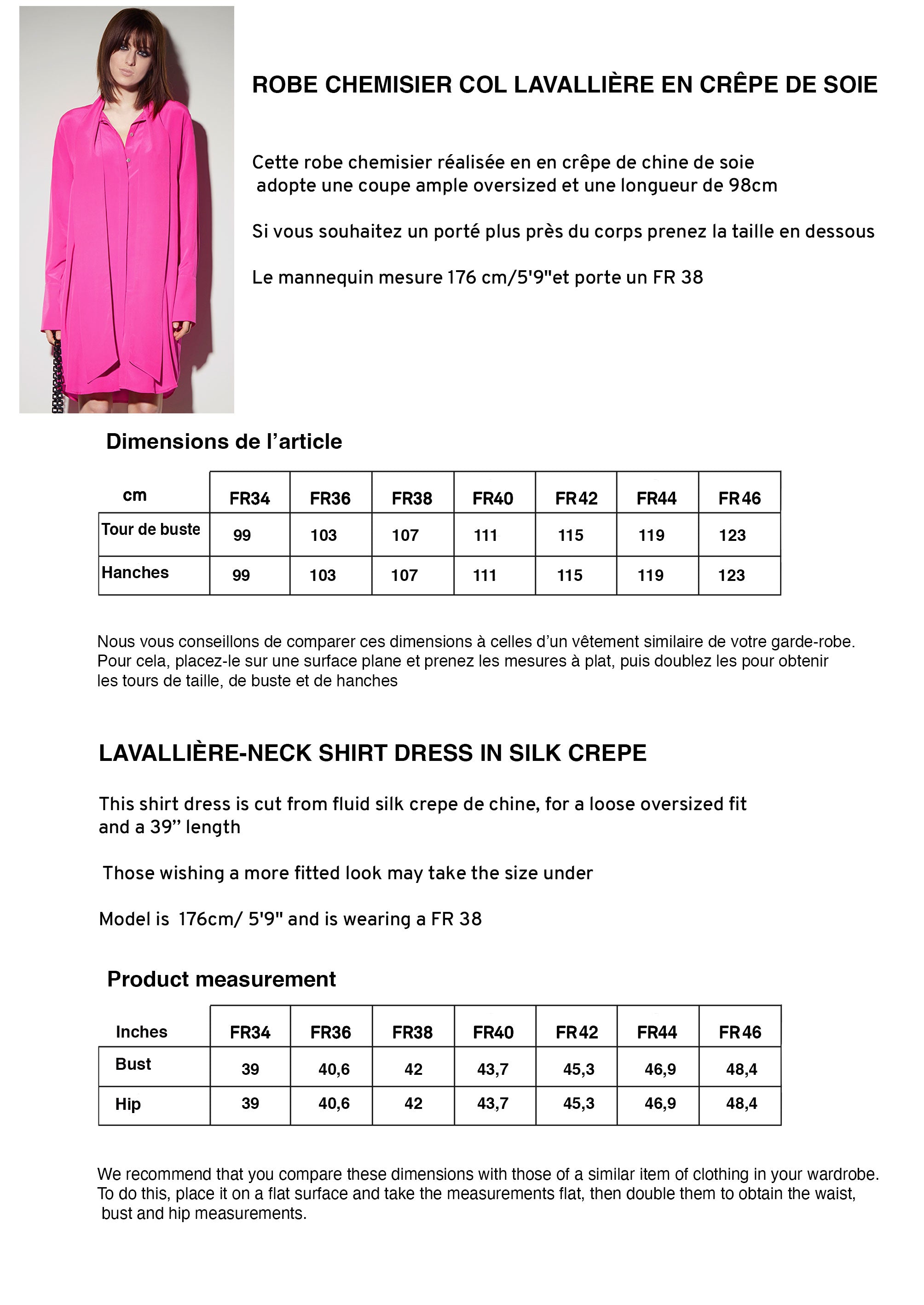 ROBE CHEMISIER, REALISÉE EN CRÊPE DE CHINE DE SOIE FUCHSIA, COUPE AMPLE ET FLUIDE, COL DOTÉ DE LONGS LIENS FLUIDES À PORTER ENROULÉS AUTOUR DU COU, EN LAVALLIÈRE OU À LAISSER NONCHALAMMENT TOMBER.