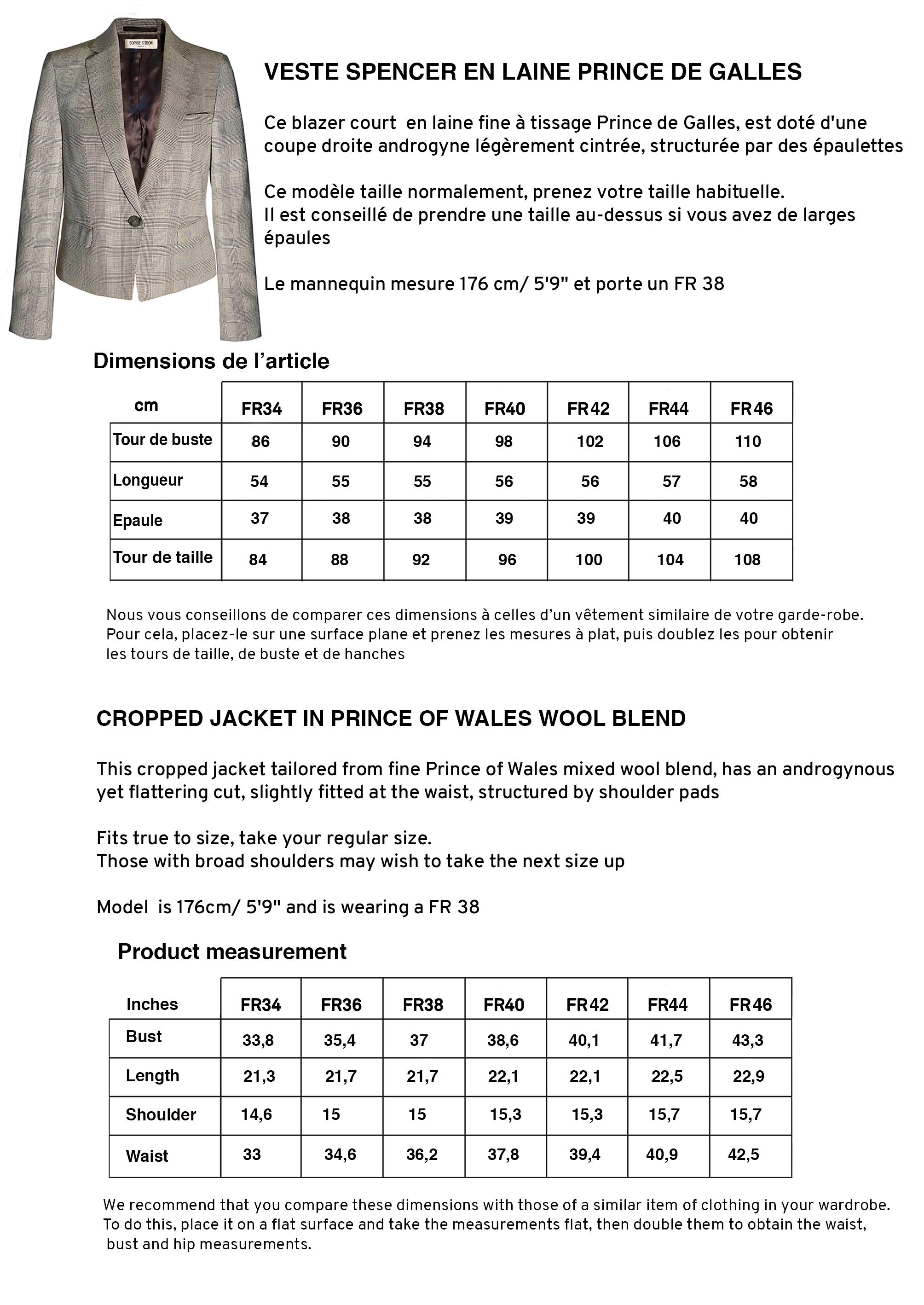 Le mannequin mesure 1,76m et porte la veste en taille 38,
